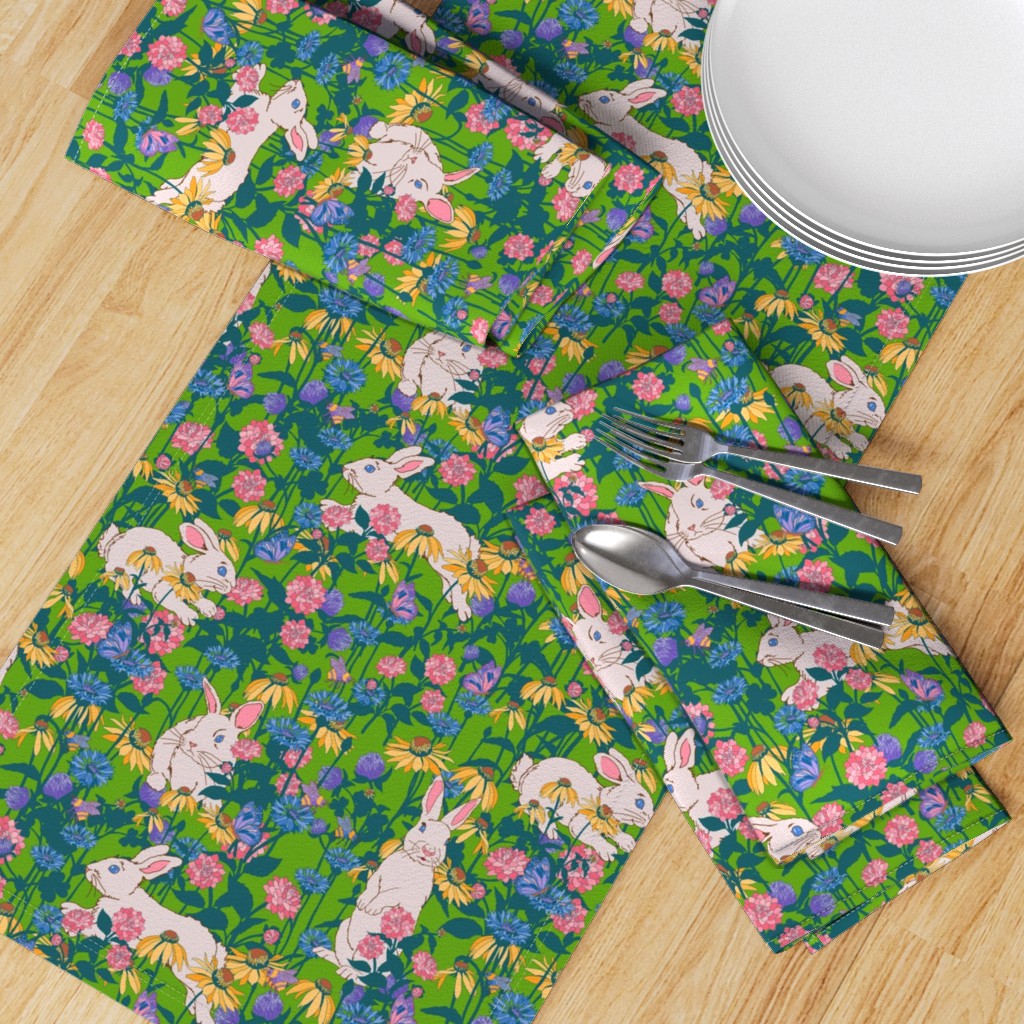 The Cotton Bunny Hop Meadow collection captures the essence of spring with scenes of joyous bunnies hopping, bees buzzing, and butterflies flitting around a vibrant floral meadow. The palette includes traditional spring colors with added darker hues, offering a variety of colors to mix and match for a sophisticated and elegant touch.